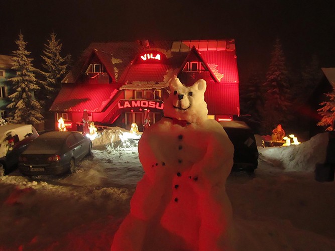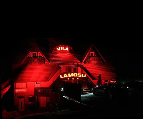 Proiect de iluminat arhitectural de exterior cu LEDuri pentru pensiunea La Mosu din statiunea montana Straja, utilizand proiectoare liniare cu LEDuri RGB