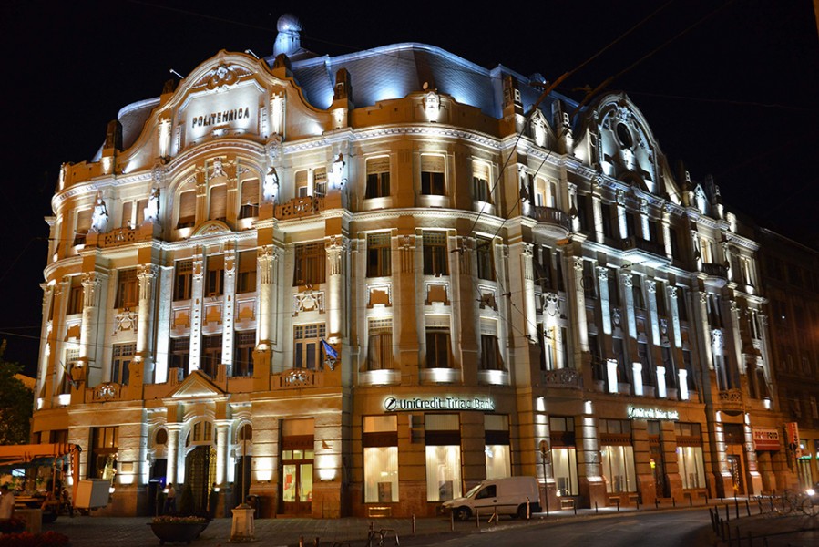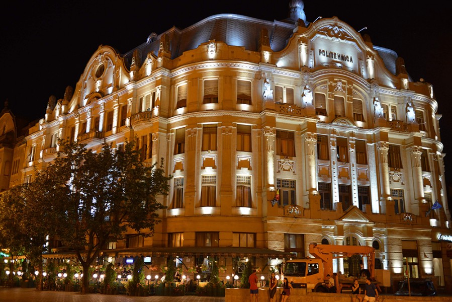 Proiect de iluminat arhitectural cu LEDuri pentru cladirea rectoratului UPT (Universitatea Politehnica Timisoara) realizat cu spoturi si proiectoare liniare