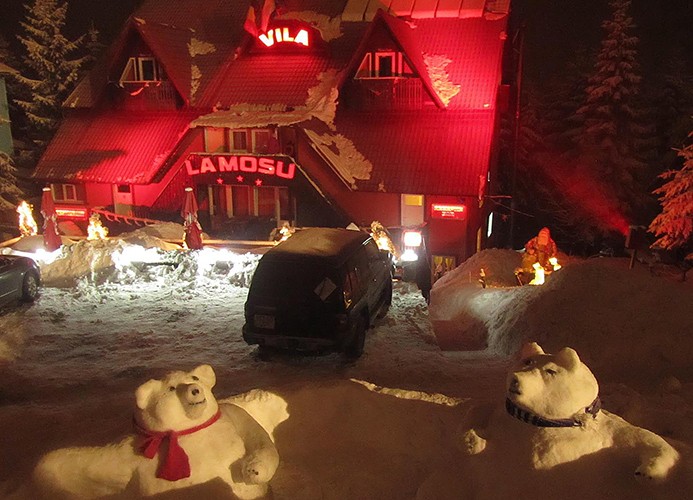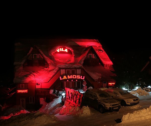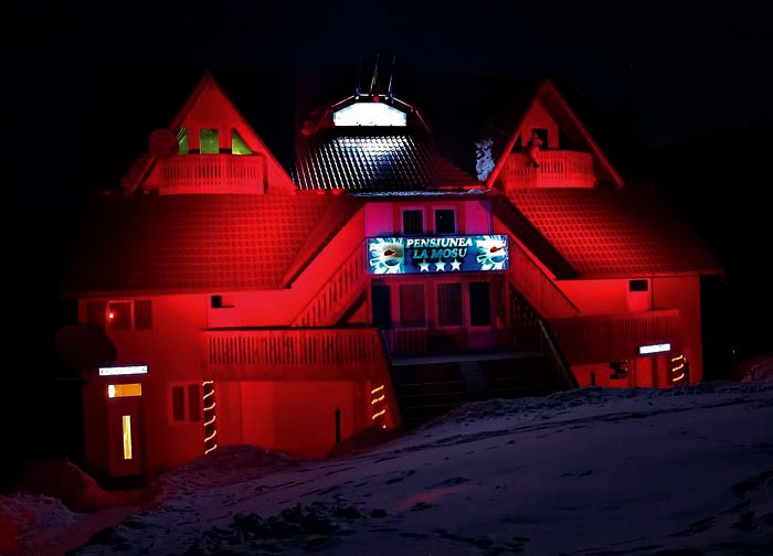 Proiect de iluminat arhitectural de exterior cu LEDuri pentru pensiunea La Mosu din statiunea montana Straja, utilizand proiectoare liniare cu LEDuri RGB